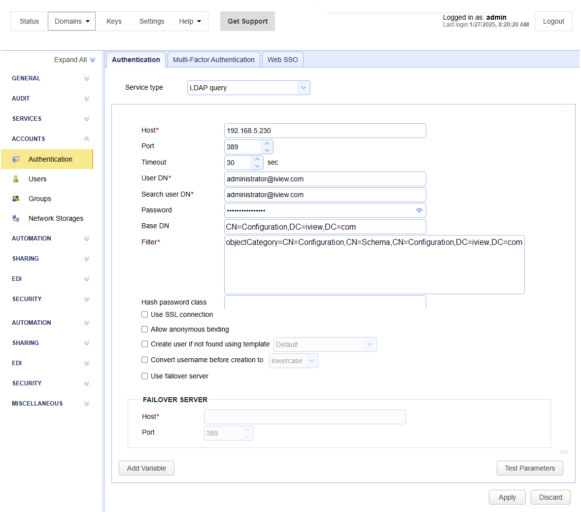 Domain user authentication is the most basic form of authentication. Authentication uses local User accounts created in a Domain. See the image below, where the Service type field is domain user authentication. When this authentication option is selected, an MFT Server Administrator must create Users in the Domain ACCOUNTS > Users > Users grid, then provide each User with their Login and Password. The password is stored encrypted in the MFT Server database.