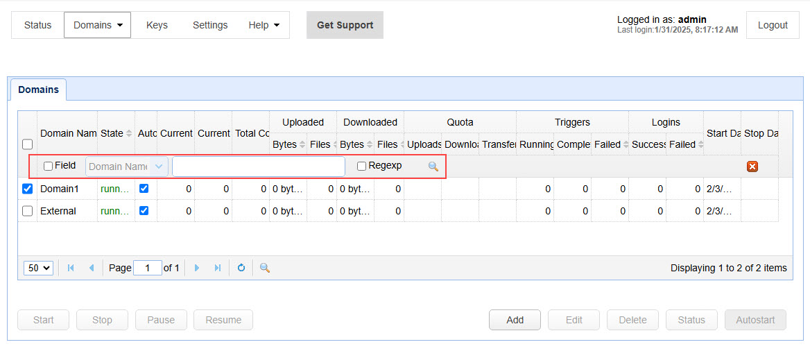 The Domains grid supports the search option. The search elements and behavior are a bit different for this grid, as described below.