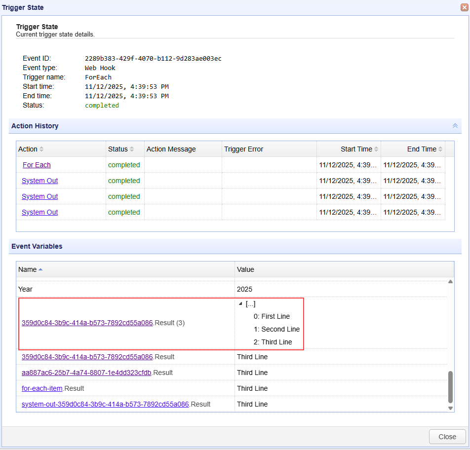 Let's modify the example a bit, keeping the ForEach Action the same, but deleting the Append File Action, and replacing it with a System Out Action. The Message field in System Out is set to %GetActionResult("for-each-item")%.
