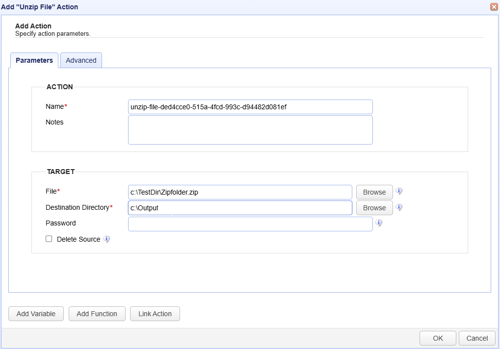Delete source — If selected, the source zip file is deleted after the file is unzipped.