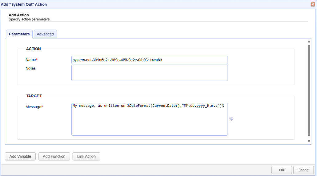 1. Troubleshooting (debugging). For example, you can add System Out Actions at different points in the Trigger workflow sequence. The message would reflect where the points are, like "Starting file transfer block" or "Condition A was met". You can also use System Out to output the current value of trigger variables. This is crucial for verifying that variables are being set correctly before they are passed to a subsequent Action. For example: "Processing file: %File%", where File is the name of the event variable.