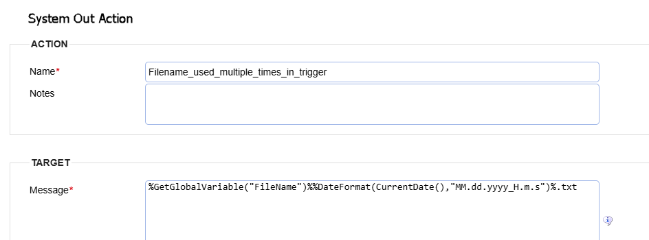 Using System Out to capture a value is optional. However, it reduces redundancy and improves maintainability by ensuring you only define the complex file name logic once. If you choose not to use System Out, you must repeat the entire file name expression: %GetGlobalVariable("FileName")%%DateFormat(CurrentDate(),"MM.dd.yyyy_H.m.s")%.txt in every subsequent Action field that needs it.