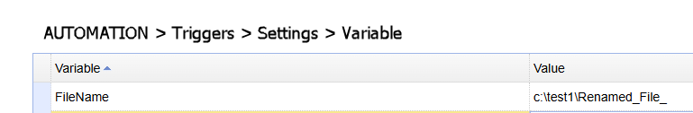 AUTOMATION > Triggers > Settingsnamed FileName. See the image below that displays its value -c:\test1\Renamed_File_. GetGlobalVariable returns the value of this variable.