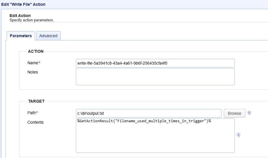 The return value of the System Out Action can be used by any subsequent Action that requires it. In the example below, the file name generated by System Out is stored and then passed to the Write File Action (where the file name itself is written to the output.txt file).