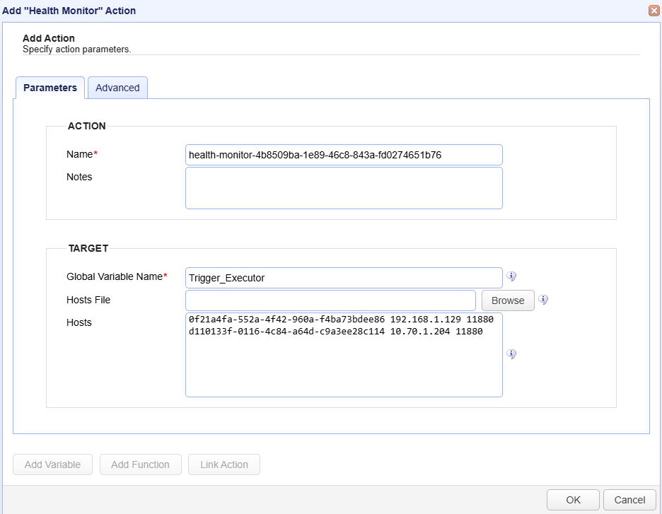 A use case for this Action is as follows: Assume you have one or more Triggers configured using the Trigger Event type Current Time. This type of Trigger runs (by default) on all active MFT Server instances in an HA environment. Assume you want to limit the execution to one MFT Server instance. You can accomplish this using the Health Monitor Action.