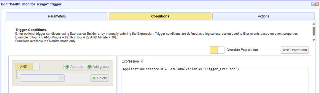 Now that the Health Monitor Trigger is complete, it's time to apply the Trigger Condition expression to the one or more Triggers that are configured using the Current Time Event type. The condition would look similar to what is displayed below - ApplicationInstanceId = GetGlobalVariable("Trigger_Executor").