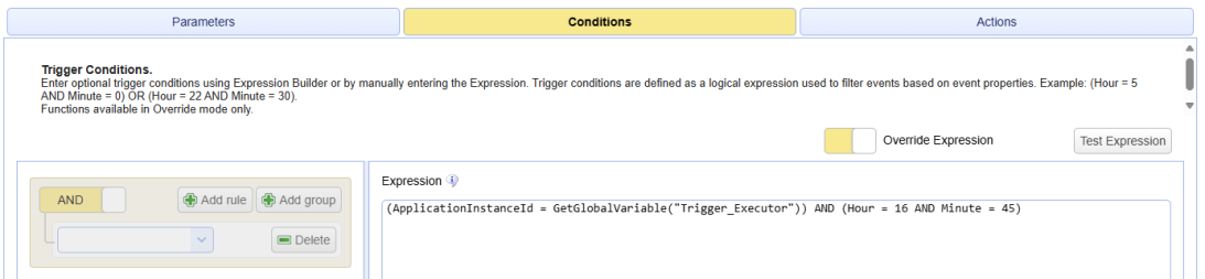 The Trigger Condition will look this: ApplicationInstanceId = GetGlobalVariable("Trigger_Executor"), where Trigger_Executor is the configurable global variable name. You must manually enter the Condition Expression (enable Override Expression) because the expression contains a function, which is not supported when using the expression builder option.