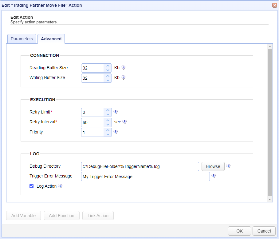 TheGetActionResultfunction also supports using the ActionNameas an input parameter. This is an enhancement added in a more current version of MFT Server.Using Link Action