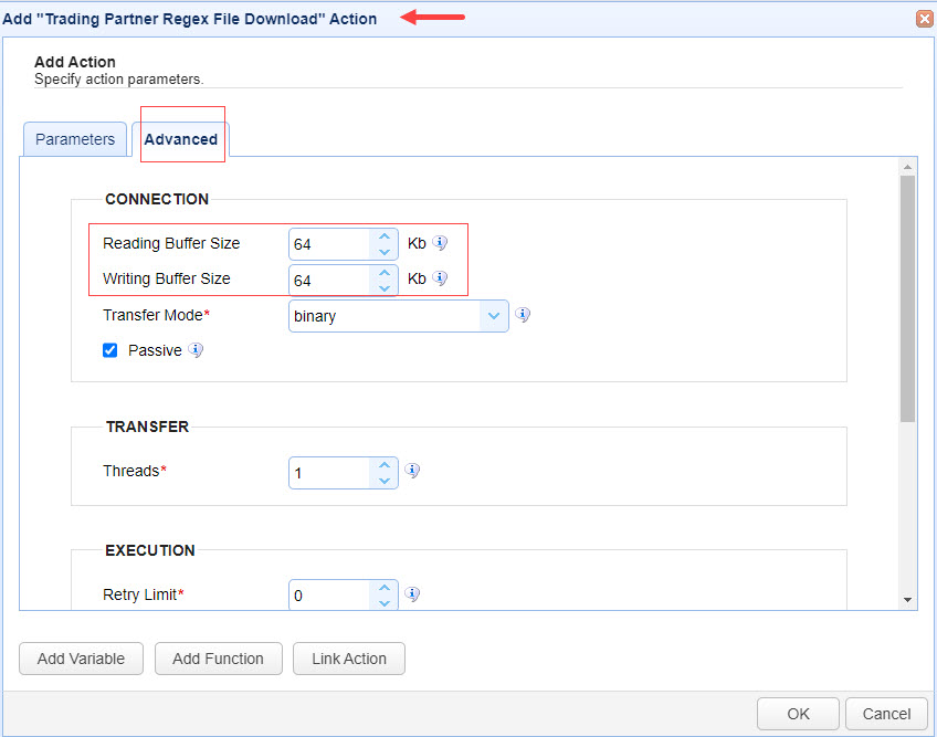 It has been reported that the Trading Partner Regex File Download action, when used with an SFTP trading partner, is creating 0 byte files when the Writing Buffer Size is set to 512 KB and the Reading Buffer Size is set to 4 KB. The trigger action is not failing when this happens, creating a false impression that the download is working successfully.