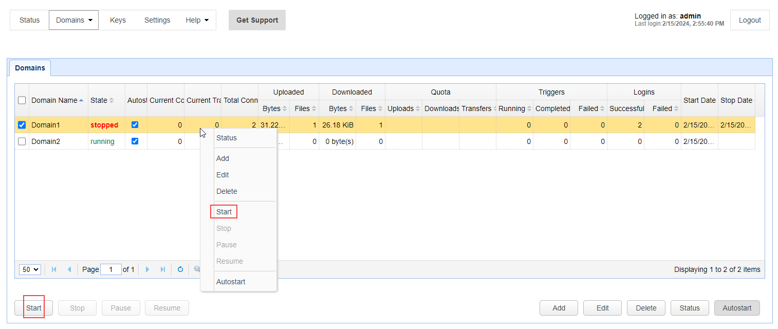 You can start a domain by accessing it in the Domains grid. Navigate to Domains > View domains, which will pull up the Domains grid, depicted in the image below. From there, select the domain you wish to start. Click the Start button located in the lower left of your screen, or right-click and select Start from the pop-up menu. This will start the domain. The Start button is also available when editing a domain that is stopped (you will see it at the bottom of the page).