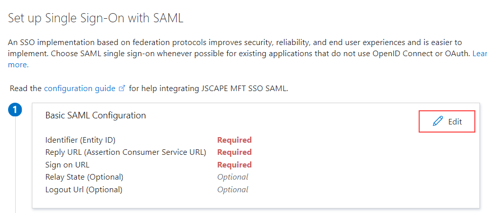 Set up Single Sign-On with SAMLscreen, click on theEditbutton to the right of theBasic SAML Configurationsection.