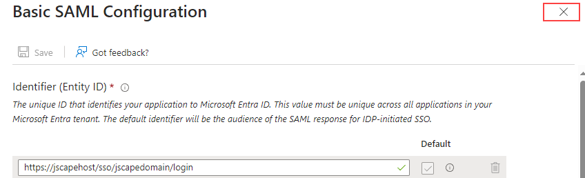 Basic SAML Configurationscreen if it does not automatically close after clicking on theSavebutton. Click on theXbutton to do this.