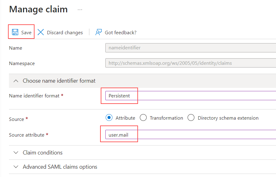 Manage claimscreen, change theName identifier formatdropdown field fromEmail addresstoPersistentand change theSource attributedropdown field fromuser.userprincipalnametouser.mailthen click on theSavebutton.