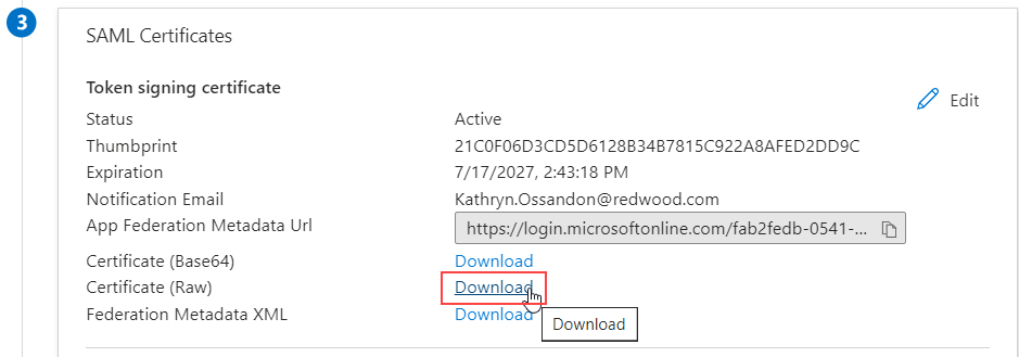 SAML-based Sign-onscreen, click on theDownloadlink besideCertificate (Raw)field under theSAML Signing Certificatesection. The resulting certificate file will be used in the succeedingJSCAPE Configurationsection of this article.