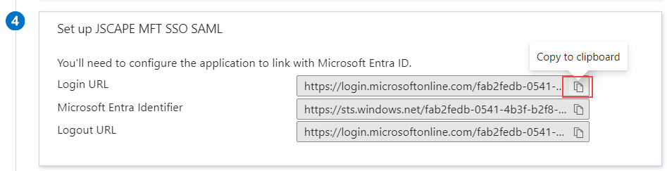 Copy to clipboardicon to the left of theLogin URLfield, located under theSet up <NAME>section. NAME will be whatever you entered in step 5. TheLogin URLwill be used in theJSCAPE Instructionssection located below.