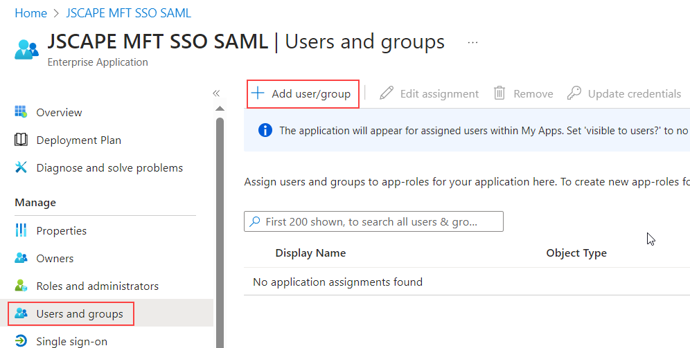 Integrating JSCAPE Web SSO (SAML) with Entra ID requires adding an application from the Microsoft Entra admin center app gallery. The application that will be added is called Microsoft entra SAML Toolkit, which comes from Microsoft. The steps below will show how to add said application and configure it to work when signing in to the MFT Web Client.
