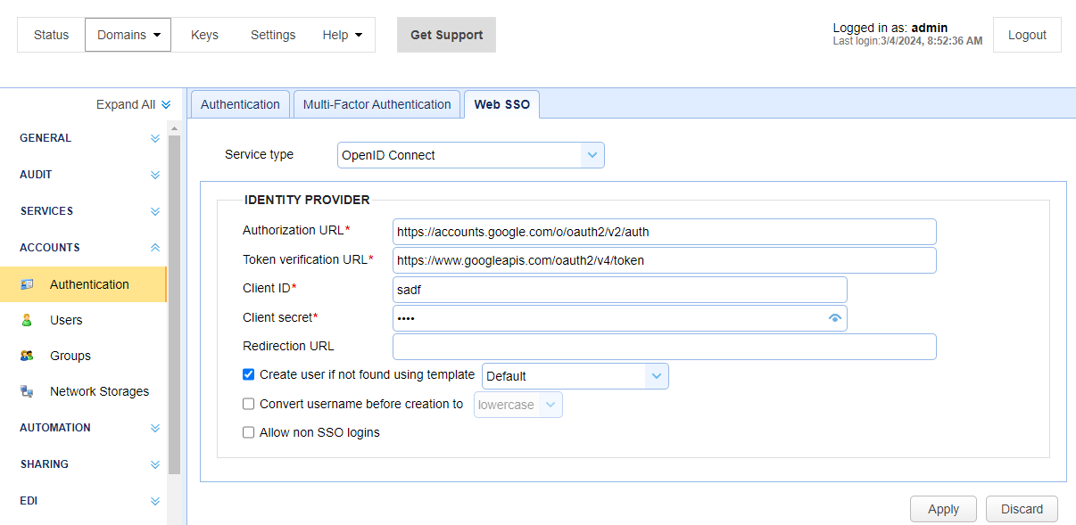 Redirection URL - The URL where the identity provider sends responses after a successful authentication. This field is used for JSCAPE SaaS installations only, and it is required. The format is: https://<hostname>/sso/<domain-name>/login.