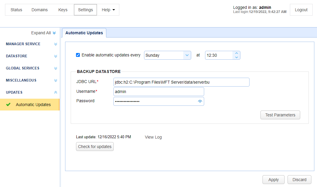 When you click on the Settings > UPDATES > Automatic Updates module, the Automatic Updates tab will display the status of the automatic update feature, which is either enabled or disabled. Automatic updates are disabled by default. When enabled, you can enter the day of the week and the time that the system will check for an MFT Server application update. If an update is available, it will automatically be installed, using the fields configured under the BACKUP DATASTORE heading, depicted in the image below. You will also see a Last update date that displays the last time the application was updated. To the right of the date is a View Log hyperlink which provides you with the details of the last update.