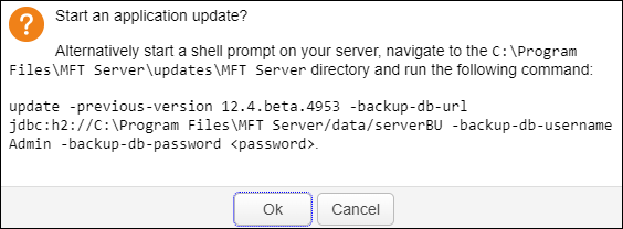 Cancel - Click Cancel if you do not want to start the update. You can apply the update at a time that is convenient for you using a shell prompt as described in the message box depicted in the image below. Please note that the update command in the message box is constructed using the saved JDBC URL and Username fields as depicted in the image above. If you run the update using a shell prompt, restart the MFT Server Manager when the update is complete (if the UI was open when the update command was executed). After logging in to the MFT Server Manager, the Settings > UPDATES > Automatic Updates > Automatic Updates tab will display the Last update date and time, along with a View Log link.